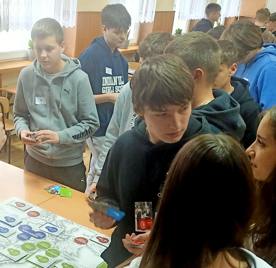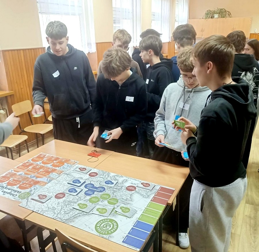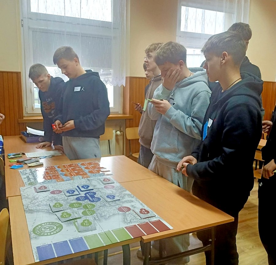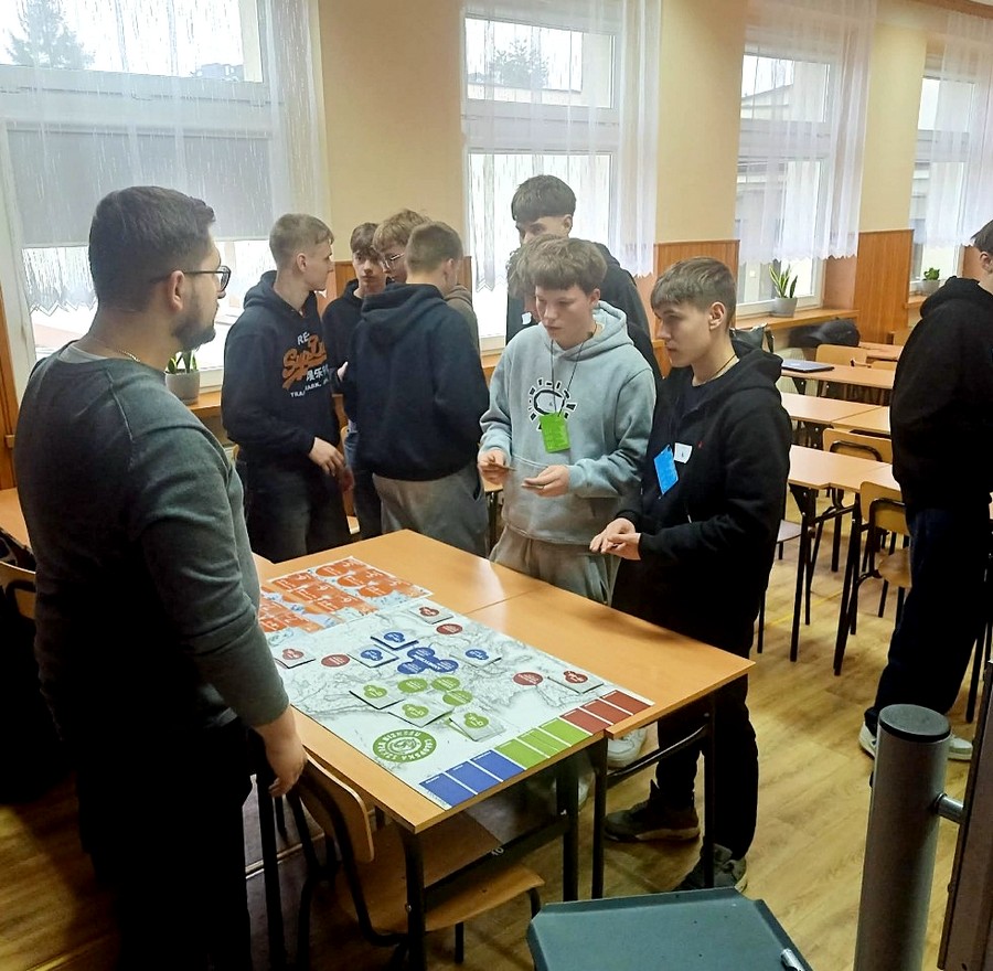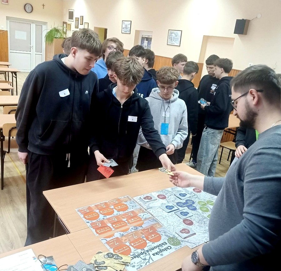 31 marca 2026 podczas spotkania z pracownikiem samorządowym z ROPS uczniowie klasy 1c zagrali w grę planszową, która pozwalała w przyjazny i zabawny sposób zrozumieć zasady rządzące ekonomią społeczną.